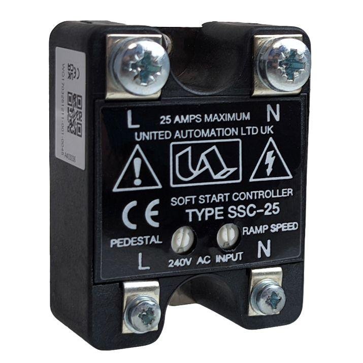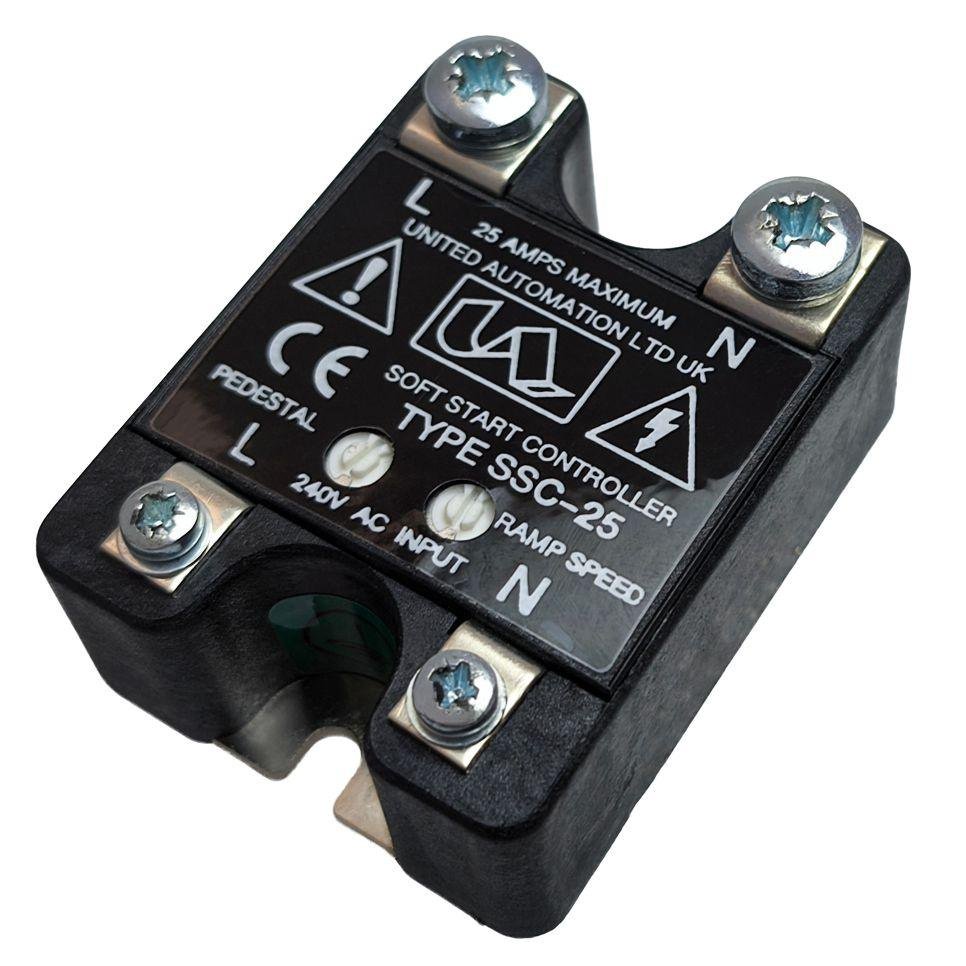 The SSC-25 Soft Start Controller is a compact, mains-operated soft-start power module designed to deliver smooth, controlled start-up of AC loads, reducing mechanical stress, electrical shock and nuisance tripping. Suitable for 110V and 230V AC systems, the SSC-25 is ideal for applications where high inrush current can shorten equipment life or disrupt power supplies.