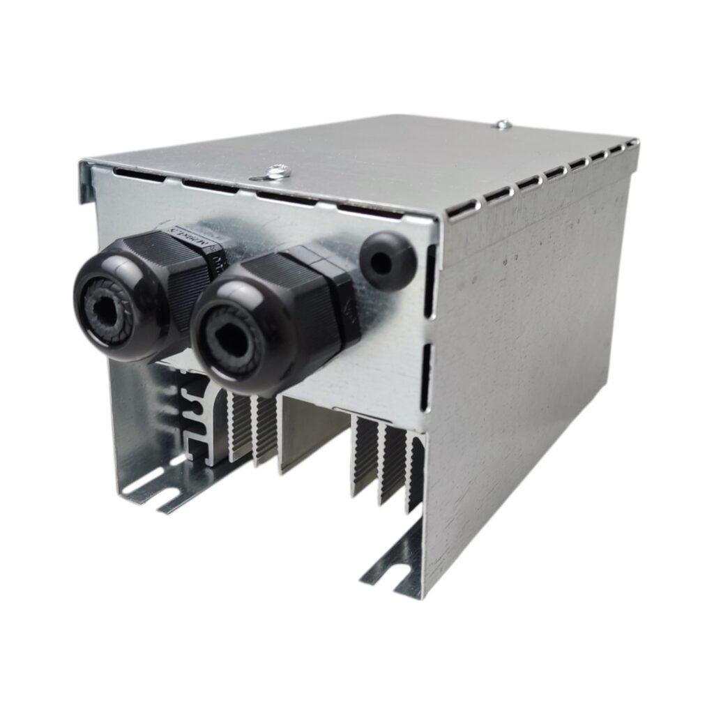 The VAC2-3/RFI is a compact, high-performance single-phase fan controller, designed to regulate up to 3A of inductive loads such as induction motors, fans, and pumps. Operating at 230V, this open-construction variable phase angle regulator provides fully adjustable voltage outputs from zero to maximum, ensuring precise control for various applications.